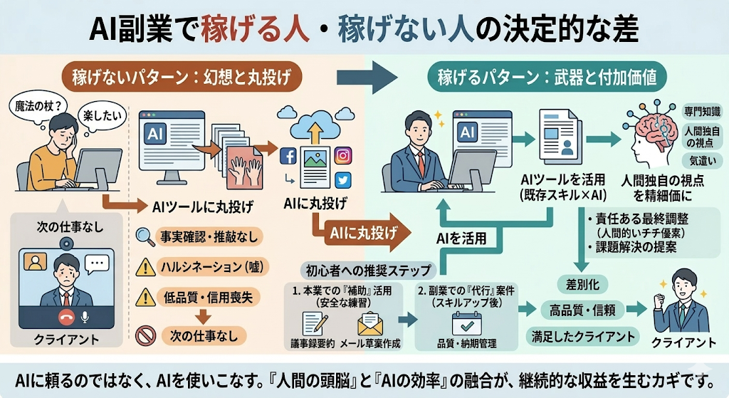 AI副業市場において収益を上げる人と挫折する人の違いは明確です。